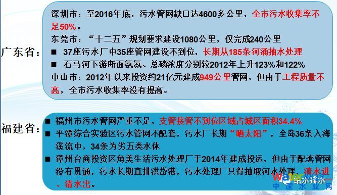 深圳市,環(huán)保督察認定污水管網(wǎng)的缺口達4千多公里,全市污水收集率不到50%,今年年初香港有一個報紙報道這個問題,引起了重視,實際上說明管網(wǎng)的問題是很嚴重的。還有東莞,好多市政設計院參加了東莞幾十個中心廠的設計,但是37座污水廠中35座管網(wǎng)建設不到位,長期抽河里的水。中山建了好多管網(wǎng),900多公里,但是由于工程質量不高,污水收集率并沒有提高。
