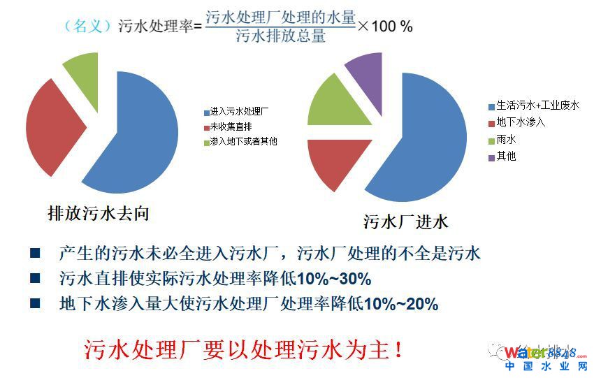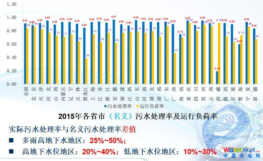 污水處理率指經(jīng)過處理的生活污水、工業(yè)廢水量占污水排放總量的比重。其實污水處理率這個指標也有很大的局限性。排放產(chǎn)生的污水一部分進了污水廠,一部分沒有收集直排了,再有一部分,地下水位比較低的地區(qū),滲入地下。不同污水處理廠處理的水也不完全一樣,一部分是污水,其余的還有地下水的滲入或者是雨水還有其它,產(chǎn)生的污水也未必進入污水處理廠,污水處理廠處理未必全是污水。由于污水直排使實際的污水處理率降低了10%到30%。地下水的滲入使實際的污水處理廠處理率降低了10%到20%。這是咱們國家一些主要各個省市,2015年的污水處理率。如果按照剛才的推算,實際上絕大多數(shù)地區(qū)實際污水處理率要降低20%到40%,我們建議,在考核污水處理率指標的同時,考核城鎮(zhèn)通過污水處理廠去除的污染物總量,直到水環(huán)境達標。這樣倒逼區(qū)域污水管網(wǎng)的建設和污水處理廠的改造。