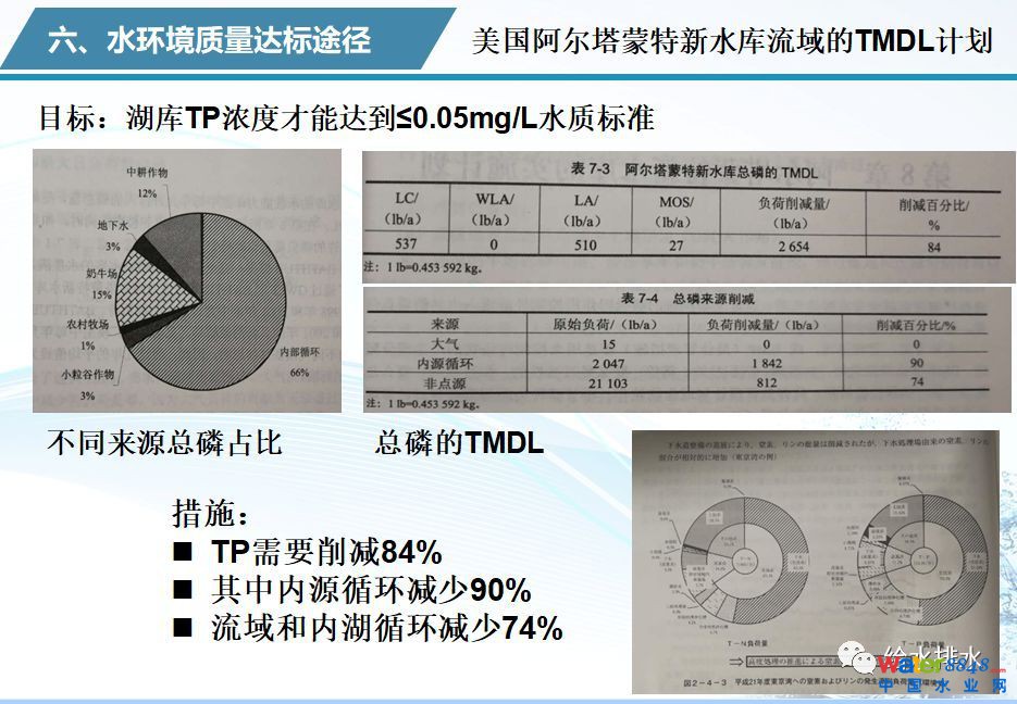 水環(huán)境質量達標的途徑有很多,我的建議是,不要一看到水環(huán)境質量不達標,就給污水廠提標,污水廠的提標實際上只是一種路徑,咱們一定要有這樣一張圖,這段時間不少人在討論日最大污染負荷(TMDL)的這種方法,這是我們找的美國一個水庫的TMDL計劃,一定要有一張表,這個地區(qū)、區(qū)域,主要污染物各占多少比,這些主要污染物來自于哪,應采取哪些針對性措施。像美國的這個水庫就對污染源進行了分析,最終提出了使總磷達到0.05毫克/升標準的措施,這樣的措施才是針對性的,才能取得預期效果。