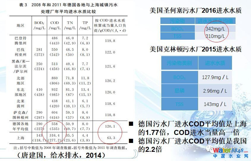 接下來看一下德國的數(shù)據(jù)。德國是2008年的數(shù)據(jù),污水處理廠廢物利用率平均值是558,按COD進水水質核算成當量人口負荷人均進水水質是120g/COD*人*d,上海是它的一半,德國污水廠進水的COD平均值是上海1.77倍,是全國平均值的2.2倍,也就是說德國每處理一噸污水,去除的COD量約是我國的2.2倍。