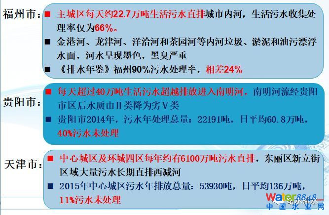 有一個說法,20%的污水直排是80%河湖黑臭的原因,這是一個大概的說法,我個人認為還是很有道理的。我們國家這方面的數(shù)據(jù)非常少,但可以用環(huán)保督察的數(shù)據(jù)作為參考。廣州作為經(jīng)濟發(fā)達的一線城市,每天是47萬噸的生活污水直排,如果用這個水給它進行一個換算,相當于廣東直排的污水是12%。同樣根據(jù)環(huán)保督察結果,北京和上海的直排量也不小。福州市環(huán)保督察的結果,認定每天是23萬噸污水直排,生活污水收集率是66%,在排水年鑒里,福州污水處理率是90%,兩個差是24%。像貴陽大約是40%的差距,天津每年6100萬噸的污水直排,折合天津總的污水排放量相當于11%的污水沒有經(jīng)過處理。以上所舉的都是我國經(jīng)濟比較發(fā)達,管理水平比較高的城市,尚且存在這樣的問題,其他城市可想而知。