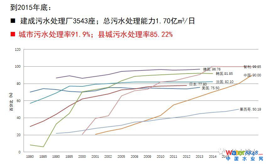 到2015年正好是“十二五”末期,前一段時間我們拿到最新2015年的數(shù)據(jù)。將我國和國外幾個國家的污水處理率進行對比,包括德國、韓國、美國、日本、墨西哥、智利那些國家做了污水處理率的比較,像德國的污水處理率一直是比較高的,韓國的污水處理率近幾十年來增長也是很快。2012年日本的污水處理率是78%、2013年美國的污水處理率是76%,單純看我國的污水處理率應該都超過了美國和日本。但是咱的污水處理率只是城市和縣城的污水處理率,不含大部分村鎮(zhèn)。