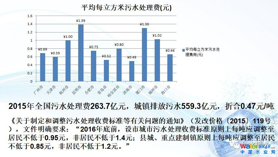 再一個,各個地方污水處理成本,我們也測過幾個污水處理的成本。天津的運行成本都在1.5塊左右。我們對全國36個重點城市污水處理費做過分析,實際上得到了十幾個城市污水處理費,大多數(shù)地區(qū)都沒有達到發(fā)改委要求的0.95元和1.4元的標準,2015年總的污水收費大平均也只有0.47元,現(xiàn)在各個地方提標的時候,一定要想想現(xiàn)在污水處理收費能不能支撐污水處理廠的提標。前段時間我去南方某市調(diào)研,該市每年對污水處理廠的補貼是20多億,是不是每個地方都有這樣的財政能力對污水處理廠進行補貼。