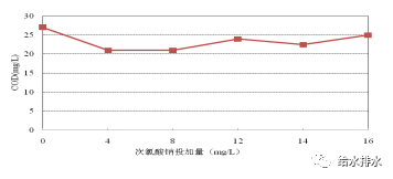 次氯酸鈉是污水廠常用的消毒劑和脫色劑,同時對污水中難降解有機物也具有一定氧化效果。試驗發(fā)現(xiàn)次氯酸鈉對COD的最大去除率為22%。但是,當次氯酸鈉投加量超過于8mg/L時,對COD的測定有一定影響,COD濃度反而增大。
