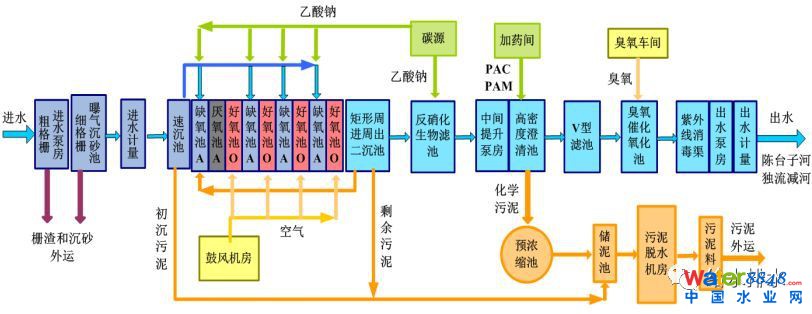 推薦采用“改進多級AO工藝+反硝化生物濾池+高密度澄清池+V型濾池+臭氧高級氧化工藝方案”。