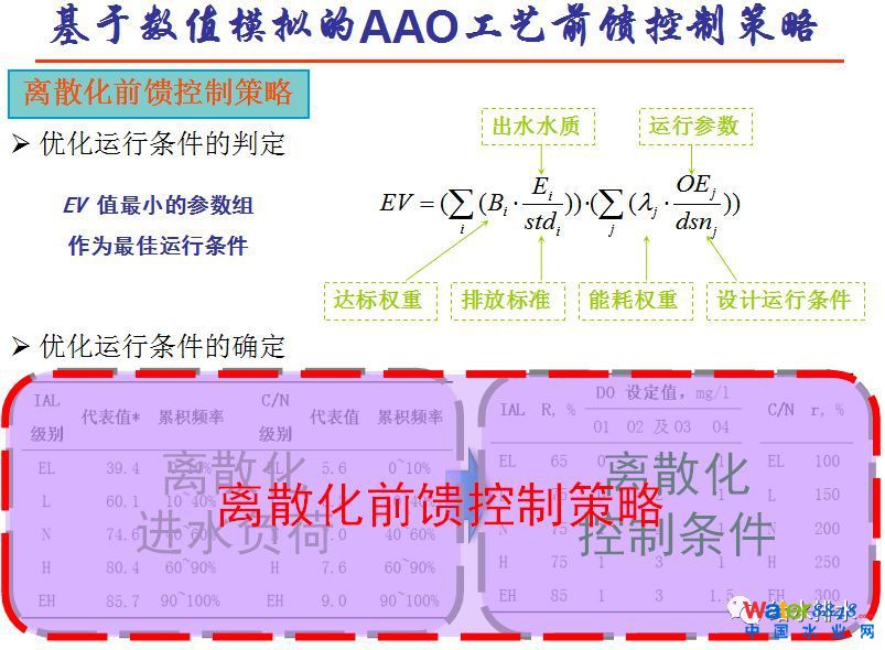 經(jīng)常有人問ICA的控制模型能不能用在污水處理上。ICA是很好的原理模型,但是很復(fù)雜,這樣的模型不能直接用在污水廠的PRC控制,我們現(xiàn)在用的PRC控制系統(tǒng)沒有這么強(qiáng)的計(jì)算能力,用IAL模型,可以做運(yùn)行的條件,有了運(yùn)行條件以后,將其離散。污水廠實(shí)際的調(diào)整不是實(shí)時(shí)在那不斷調(diào),按點(diǎn)調(diào)不可能,所以離散化變成階段條件,一段負(fù)荷是一個(gè)運(yùn)行調(diào)劑,形成離散負(fù)荷條件。根據(jù)離散負(fù)荷條件,做出離散運(yùn)行因素條件,這樣形成控制模型。這個(gè)模型按照常理的POC,這么多年我們基本做的這樣一種模型。