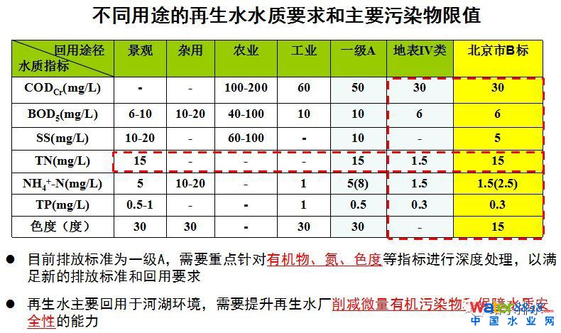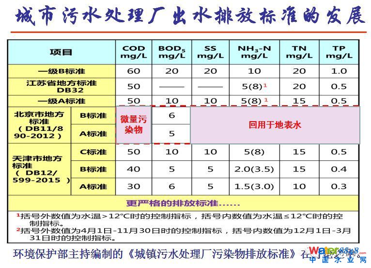 長(zhǎng)期以來(lái),不斷有一些新的排放標(biāo)準(zhǔn)推出,包括原來(lái)2002年推出的GB18918標(biāo)準(zhǔn),還有地方標(biāo)準(zhǔn)嚴(yán)于國(guó)家標(biāo)準(zhǔn)的情況,原來(lái)一直說國(guó)家標(biāo)準(zhǔn)是一刀切,可現(xiàn)在北京、天津、江蘇、合肥的地方標(biāo)準(zhǔn)都比國(guó)標(biāo)還高。這些標(biāo)準(zhǔn)里,氮磷控制比原來(lái)一級(jí)A要嚴(yán),COD也從一級(jí)A的50降到30甚至20。從環(huán)境風(fēng)險(xiǎn)和環(huán)境健康角度去看,這部分其實(shí)除了對(duì)有機(jī)物耗氧考慮,還有微量污染物的環(huán)境風(fēng)險(xiǎn)考慮。之前一級(jí)A的標(biāo)準(zhǔn)是為了滿足再生水的要求,現(xiàn)在新的再生水標(biāo)準(zhǔn)也在制定之中,會(huì)進(jìn)一步推進(jìn)我們水處理技術(shù)發(fā)展。