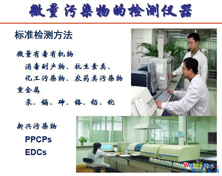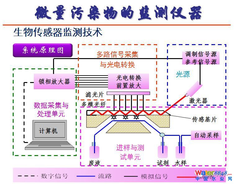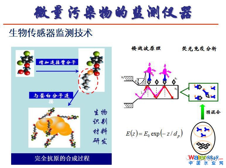 微量污染物可以用生物傳感器監(jiān)測(cè)技術(shù),在芯片表面,激光鏡產(chǎn)生V的能量,芯片表面消失了敏感物質(zhì),進(jìn)來(lái)的水樣經(jīng)過,比如說抗體和核算標(biāo)記的進(jìn)行反應(yīng),反應(yīng)以后流過界面,表面就會(huì)把這些污染物識(shí)別的材料固定,固定以后,如果有激光進(jìn)來(lái)就會(huì)發(fā)生熒光,熒光可以被測(cè)定。