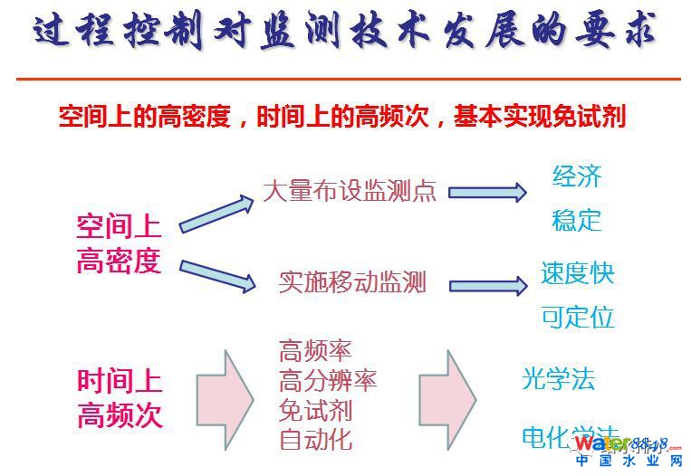 結(jié)合到更高標(biāo)準(zhǔn)的要求有一些新的監(jiān)測(cè)技術(shù)和控制技術(shù)發(fā)展。從運(yùn)行角度,我們是希望有更大量數(shù)據(jù)能夠?qū)崟r(shí)準(zhǔn)確告訴我們這個(gè)系統(tǒng)狀態(tài)是什么樣。所以一個(gè)是在空間密度上可能要增加測(cè)試,在時(shí)間頻次上也要增加測(cè)試。既然這樣要求,就有兩方面,一方面就說我這個(gè)儀器比較廉價(jià),經(jīng)濟(jì)穩(wěn)定,能夠快速測(cè)定。還有,如果頻次增高,最好是免試劑頻次。