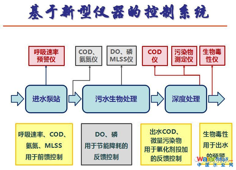在進(jìn)水有呼吸速率的儀器,對(duì)進(jìn)水監(jiān)測(cè)儀器,可以通過呼吸速率、氨氮等等給出更好的控制條件。污水生物系統(tǒng)上,有溶解氧還有污泥濃度,用來(lái)指導(dǎo)曝氣的控制。出水末端磷酸鹽濃度和流量指導(dǎo)加藥。深度處理里面,我們可以有COD在線測(cè)定儀,污染物的在線測(cè)定儀,這樣給出深度處理里邊的污染物和COD的量,可以用于控制深度處理里邊氧化劑的投量。氧化抗生素很有效,去除50%以上。氧化劑也是用電比較貴的,我們控制也是節(jié)約投加量。最后出水端,有生物毒性的監(jiān)測(cè),把關(guān)有沒有風(fēng)險(xiǎn)。