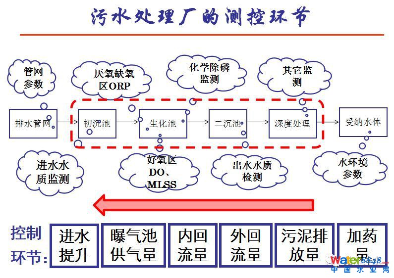 一般污水處理廠,從控制系統(tǒng)看基本就三大塊。一塊是預(yù)處理的控制,一塊生物二級(jí)處理,再有一塊深度處理。如果從排水管網(wǎng)末開始算,一直到污水處理廠一級(jí)處理二級(jí)處理和深度處理到硝化水體,要測(cè)和控的環(huán)節(jié)并不多。