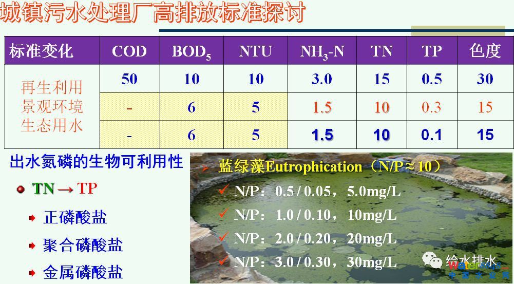 上圖池塘中,原始總磷在0.1,完全生長藻類之后把藻全部撈掉水中的磷降低到0.04,水中的磷基本上可以被藻類完全利用,所以說磷的總量控制非常重要的一個指標(biāo),這是從高排放標(biāo)準(zhǔn)以及跟再生水利用之間怎么做到均衡的關(guān)系來考慮得到的結(jié)論。也就說要達到利用的要求,磷是越低越好。