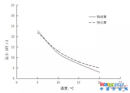 圖1 反硝化除磷系統(tǒng)中硝化菌與磷細菌最小SRT比較