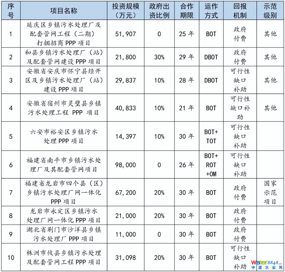 目前我國關于鄉(xiāng)鎮(zhèn)污水處理設施已經(jīng)出現(xiàn)一批PPP項目,其投資規(guī)模通常在3-6億元,主要采取BOT運作方式,部分存量項目涉及TOT存量運作,政府出資持股比例為10-30%,PPP回報機制為主要為政府付費,合作期限通常在25-30年。詳情如下表所示: