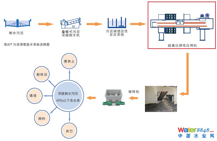 本解決方案通過系統(tǒng)集成設(shè)備及工程設(shè)施,將原生污泥濃縮后進(jìn)行改性,然后泵入容壓彈性壓榨系統(tǒng)進(jìn)行深度脫水,使污泥含水率降至50%以下,經(jīng)處理后的污泥可直接進(jìn)行填埋、焚燒,也可用于綠化、制磚、燃料、有機(jī)肥等,最終實現(xiàn)污泥低費(fèi)用資源化利用的目標(biāo)。深度脫水后污泥可繼續(xù)蒸發(fā)降至40-50%的含水率。