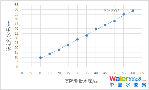 液位計傳感器是內(nèi)澇監(jiān)控點液位監(jiān)測系統(tǒng)的重要組成,其監(jiān)測數(shù)據(jù)直接影響到排水管網(wǎng)的調(diào)度管理決策及深隧排水系統(tǒng)的調(diào)度優(yōu)化研究結(jié)果。液位計傳感器需要選擇精度高、量程合適、穩(wěn)定性好的類型。此外,由于內(nèi)澇點通常位于城市的馬路上或人行道上,并且分布較為分散,電力和通訊設備難以匹配到位,應選取低能耗的類型;且排水管網(wǎng)的污水環(huán)境較為惡劣,需選用防水等級IP68、材質(zhì)耐腐蝕的設備。針對本系統(tǒng)所選用的壓阻式液位傳感器,在實驗室模擬排水管道窨井,放入液位計并改變窨井中液位,進行實際測量液位與設定液位的線性回歸分析,測量液位值呈現(xiàn)的線性度良好,測量值與設定值線性相關系數(shù)為0.9975,誤差較小,精度符合要求(見圖2)。此外,在測試過程中,同一液位情況下,多次進行測量,測量液位變化不大,穩(wěn)定性良好。