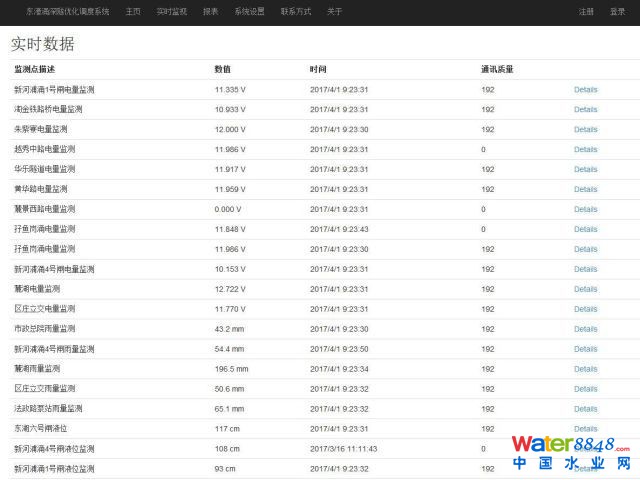 信息發(fā)布采用網(wǎng)站發(fā)布和短信發(fā)布相結(jié)合的方式,其中信息發(fā)布網(wǎng)站可通過電腦或者手機使用Internet瀏覽。深層隧道排水區(qū)域液位在線監(jiān)測系統(tǒng)是如圖3所示東濠涌深隧優(yōu)化調(diào)度系統(tǒng)的重要組成部分,發(fā)布網(wǎng)站由主頁、實時監(jiān)視、報表、系統(tǒng)設置、聯(lián)系方式等幾部分組成,可通過發(fā)布網(wǎng)站查詢液位監(jiān)測點的具體位置,在線查詢即時數(shù)據(jù),以及使用報表查詢各個監(jiān)測點的歷史數(shù)據(jù),并可通過系統(tǒng)設置功能在線查詢設備工況,以及喚醒已休眠的設備。短信發(fā)布功能則利用短信平臺執(zhí)行,在達到警戒水位的時候,采用群發(fā)短信的形式將預警短信發(fā)送給預先在系統(tǒng)中設定好的調(diào)度管理人員,使得調(diào)度人員能夠及時采取調(diào)度措施。