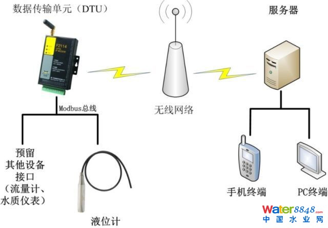 數(shù)據(jù)傳輸單元(DTU)是專門用于將串口數(shù)據(jù)轉(zhuǎn)換為IP數(shù)據(jù),通過無線通信網(wǎng)絡把數(shù)據(jù)傳輸?shù)胶笈_服務器的無線終端設備,實現(xiàn)實時監(jiān)測數(shù)據(jù)的傳輸。DTU安裝于內(nèi)澇點現(xiàn)場,通過模擬量通道或通過Modbus總線技術讀取液位計實時液位數(shù)據(jù),根據(jù)預先設定的時間間隔接收從液位計傳感器傳來的液位數(shù)據(jù),再通過GPRS將數(shù)據(jù)傳輸?shù)揭苿庸緮?shù)據(jù)中心,再傳輸?shù)酵ㄓ嵎⻊掌鞴┛刂婆_、WEB服務器和數(shù)據(jù)服務器等使用。