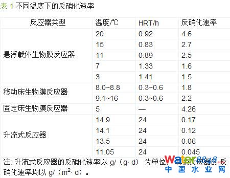生物硝化反應(yīng)可以在4~45℃的溫度范圍內(nèi)進(jìn)行。氨氧化細(xì)菌(AOB)最佳生長溫度為25~30℃,亞硝酸氧化細(xì)菌(NOB)的最佳生長溫度為25~30℃。溫度不但影響硝化菌的生長,而且影響硝化菌的活性。有研究表明,硝化細(xì)菌最適宜的生長溫度為25~30℃,當(dāng)溫度小于15℃時硝化速率明顯下降,硝化細(xì)菌的活性也大幅度降低,當(dāng)溫度低于5℃時,硝化細(xì)菌的生命活動幾乎停止。大量的研究表明,硝化作用會受到溫度的嚴(yán)重影響,尤其是溫度沖擊的影響更加明顯。由于冬季氣溫較低而未能實現(xiàn)硝化工藝穩(wěn)定運(yùn)行的案例較為常見。U.Sudarno等考察了溫度變化對硝化作用的影響,結(jié)果表明,溫度從12.5℃升至40℃,氨氧化速率增加,但當(dāng)溫度下降至6℃時,硝化菌活性很低。