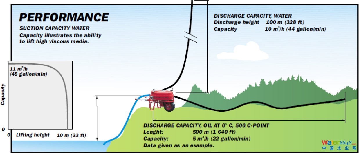 Salarollpump溢油收集系統(tǒng)對(duì)水的吸入高度可以達(dá)到10m,流量為11m³/h;揚(yáng)升高度可達(dá)為100m,流量為10m³/h;對(duì)于0℃條件下,500 C點(diǎn)的油,流量5m³/h時(shí),可水平輸500米。
