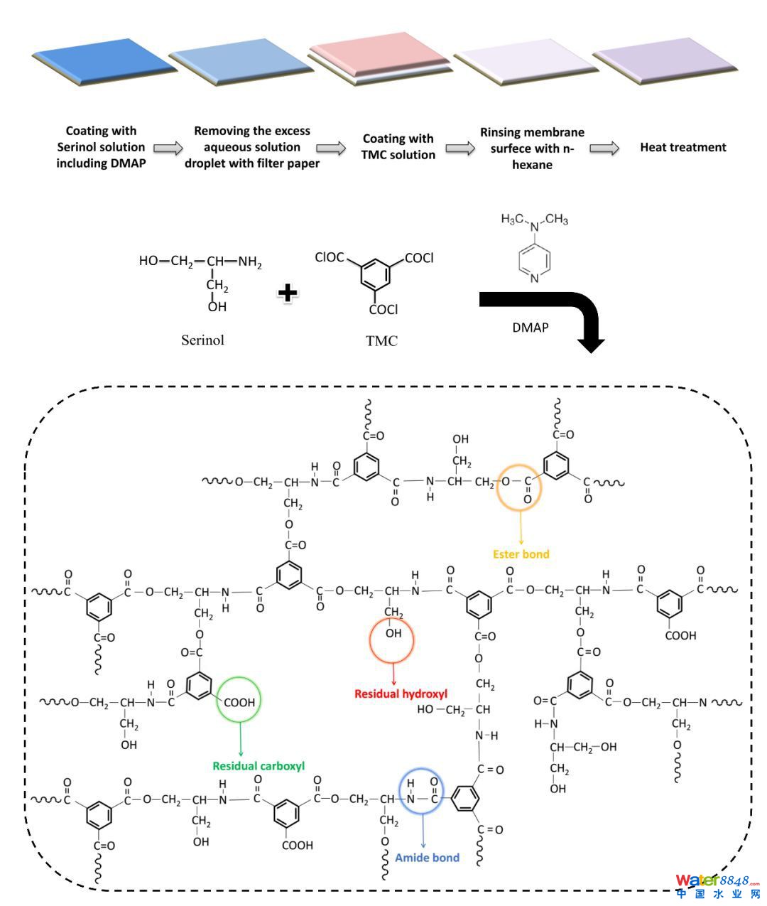 中文題目:基于4 -二甲基氨基吡啶(DMAP)催化作用的界面聚合法(以絲氨醇和均苯三甲酰氯為聚合單體)制備新型聚酯酰胺復(fù)合納濾膜