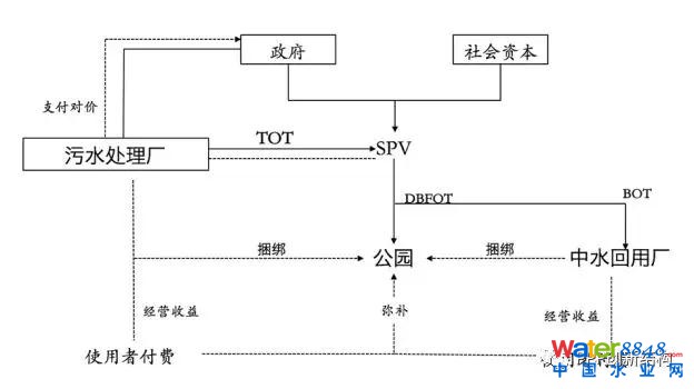 運作模式說明:將已建設(shè)完成、正在運行中的污水處理廠作為存量資產(chǎn)轉(zhuǎn)讓給項目公司,同時將該地公益性質(zhì)的濕地公園與可以產(chǎn)生現(xiàn)金流的中水回用廠進行捆綁打包,這樣可以用污水處理廠的污水處理費收入與中水回用廠的中水收益彌補公益性濕地公園的建設(shè)、運營成本,減少政府的支出責任。