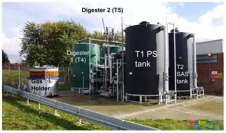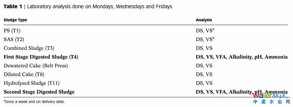 研究人員每周在各個采樣點進行三次采樣,具體采樣點與分析項目見表1。兩級厭氧消化產生的沼氣組分由氣相色譜儀進行分析,污泥送至泰晤士水務公司實驗室進行分析。