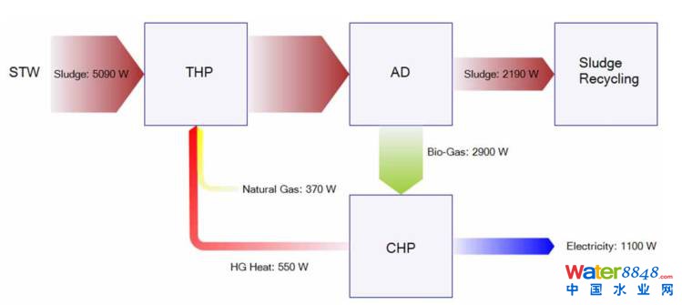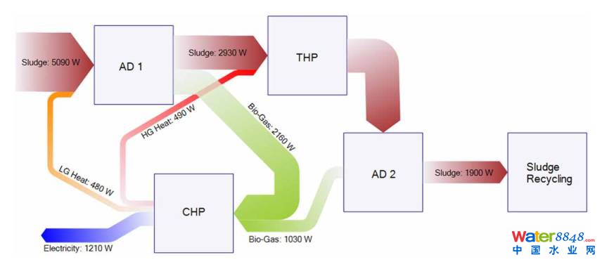 傳統(tǒng)THP工藝需要大約12bar的壓力,工藝能耗大約為0.51~0.53MWh/TDS,但缺點是熱電聯(lián)產產生的熱量不足以滿足THP工藝對熱源的需求。圖6是傳統(tǒng)THP+AD工藝的能量流;鶊D。