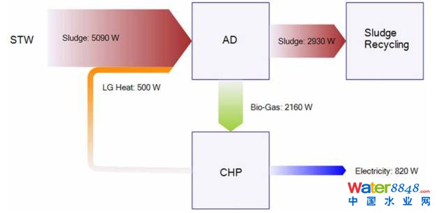 圖4 Energy Flows for Conventional AD with CHP and Land Recycling (1 kgDS/hour).