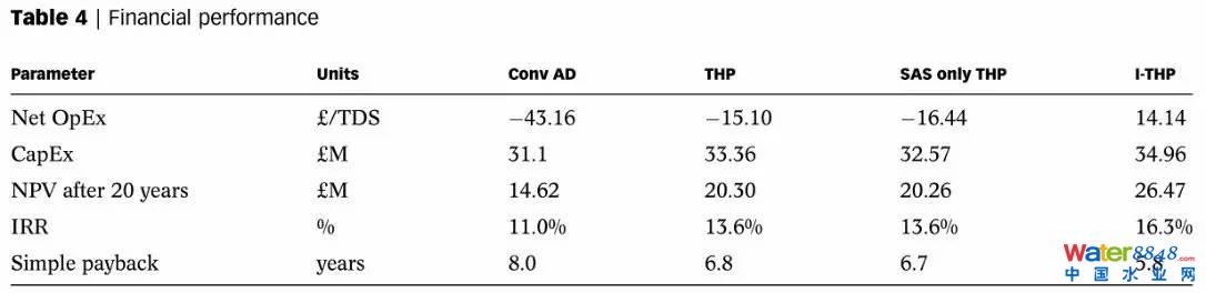 ITHP工藝的投資回收期最短,只需不到6年。傳統(tǒng)THP工藝和SAS-only-THP工藝的內部收益率相同,但由于SAS-only-THP的工藝成本略低,所以其凈現(xiàn)值相對優(yōu)于傳統(tǒng)THP工藝。如果厭氧消化的能力充裕,SAS-only-THP和ITHP工藝的資金回報還能進一步提高。