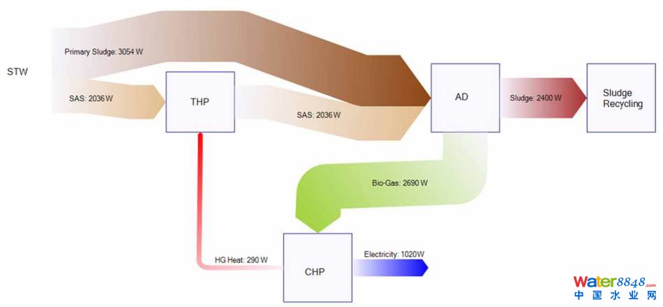 因為污泥經過初級消化后體量減小,所以該工藝占地只有常規(guī)工藝的2/3,并且由于是兩級厭氧消化,因而沼氣產量更大,沼氣總產量可達500m3/TDS,可揮發(fā)性固體去除率可達65%,電能產率為1200kWh/TDS。產能增加意味著通過熱電聯(lián)產工藝產生的熱能將有可能滿足熱水解工藝本身的熱量需求。圖9為ITHP工藝路線圖,圖10為能量流;鶊D。