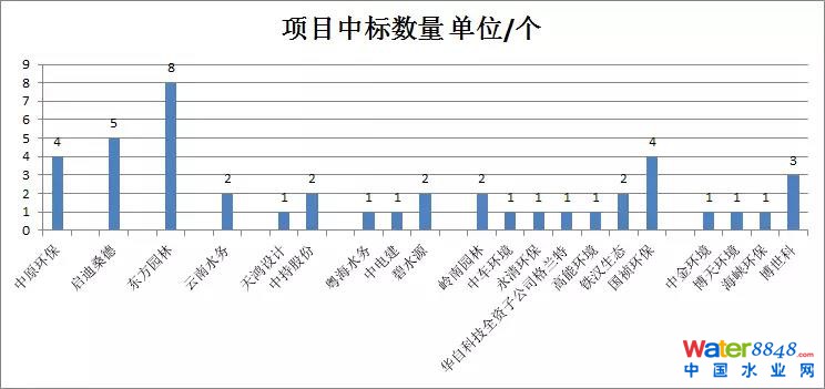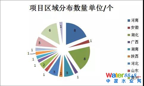 農(nóng)水市場(chǎng)項(xiàng)目數(shù)量約占14.63%,隨著將來(lái)國(guó)家出臺(tái)農(nóng)村污水排放標(biāo)準(zhǔn),日益注重效果的環(huán)境下,農(nóng)水市場(chǎng)仍待盤活。