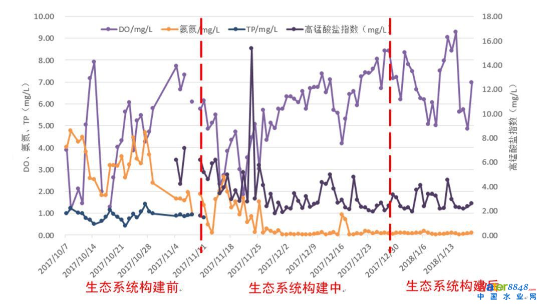 生態(tài)系統(tǒng)構(gòu)建前,污染指標(biāo)(特別是氨氮) 濃度高、波動大;生態(tài)系統(tǒng)穩(wěn)定后污染負(fù)荷得到大量消減,氨氮維持在1 mg/L以下,溶解氧顯著提高穩(wěn)定保持在5 mg/L以上。
