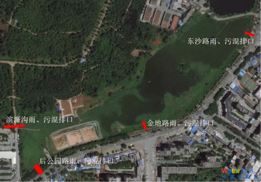 金牛嶺被譽為?谥,金牛湖位于金牛嶺公園內(nèi)是?谥蔚姆稳~。金牛湖建于1992年,占地面積約19.8萬m2,總庫容103萬m3,分南、北兩湖,其中南湖面積約6萬m2,平均水深2.0 m;南湖作為金牛湖的前置湖,接納了90%以上的入湖污染,曾經(jīng)是水葫蘆肆意生長的污水塘,水質(zhì)為劣V類。2016年5月鐵漢生態(tài)聯(lián)合中標(biāo)?谑旋埨、東西湖、金牛湖等11個黑臭水體的治理項目,開始了金牛湖的綜合治理之路。
