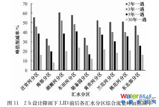 從圖12中可以看出,低影響開發(fā)措施對(duì)設(shè)計(jì)暴雨地面和管網(wǎng)徑流洪峰切實(shí)起到了削減效果,同時(shí)雨量越小削峰效果越顯著,隨著降雨強(qiáng)度的增大洪峰流量削減率逐漸減小。同時(shí),各匯水分區(qū)LID的峰值削減效果有所差異,2年一遇設(shè)計(jì)降雨下湖潮河分區(qū)的削減率最高,徑流峰值削減率達(dá)60.6%,而南部分區(qū)30年一遇設(shè)計(jì)降雨下的徑流峰值削減率僅8.2%。