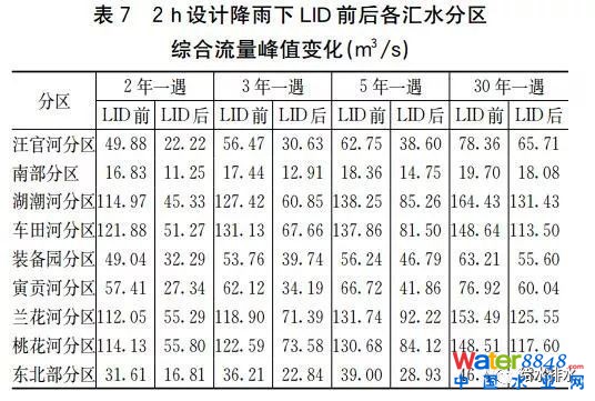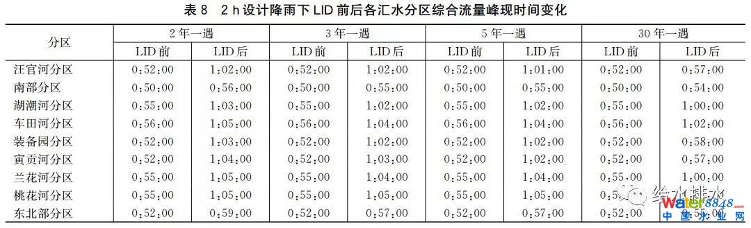 各匯水分區(qū)徑流峰值的控制效果與LID措施的布置占比大小、所形成的調(diào)蓄容積容量、雨水管網(wǎng)的管徑和管長(zhǎng)均密切相關(guān),從模擬結(jié)果看來,各匯水分區(qū)LID措施對(duì)徑流峰值的削減率、延峰時(shí)間不完全一致,如南部分區(qū)的峰值削減率最低,但其延峰時(shí)間并不是最短,這體現(xiàn)了城市降雨徑流匯流和排放的復(fù)雜性,更為精確的模擬則與真實(shí)的徑流地表漫流路徑有關(guān),建議在設(shè)計(jì)階段進(jìn)一步深化評(píng)估。