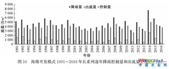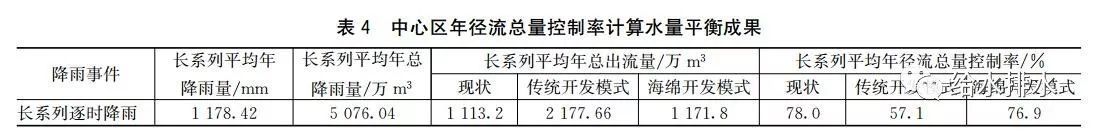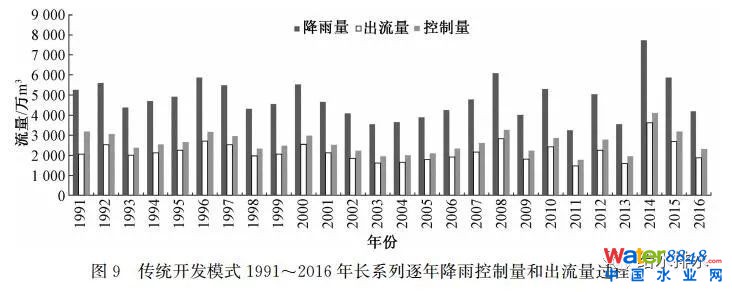 規(guī)劃采用傳統(tǒng)開發(fā)模式下,中心區(qū)各地塊長(zhǎng)系列平均年降雨出流總量為2 177.66萬(wàn)m3,降雨徑流控制量總量為2 898.38萬(wàn)m3,年徑流總量控制率為57.1%,見圖9。