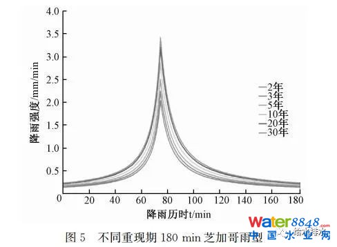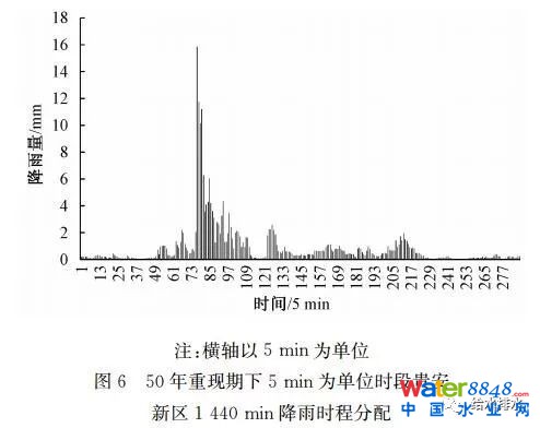 本研究采用芝加哥法確定貴安新區(qū)短歷時(shí)暴雨雨型,采用同頻率法確定長(zhǎng)歷時(shí)暴雨雨型。其中,短歷時(shí)設(shè)計(jì)暴雨歷時(shí)一般選為30 min、60 min、120 min、150 min、180 min(見圖5),適用于管道排水系統(tǒng)的計(jì)算;長(zhǎng)歷時(shí)設(shè)計(jì)暴雨歷時(shí)為1 440 min,適用于內(nèi)澇風(fēng)險(xiǎn)的評(píng)估以及雨洪利用蓄水池規(guī)模的測(cè)算。50年重視期下貴安新區(qū)1 440 min降雨過程分配結(jié)果見圖6。