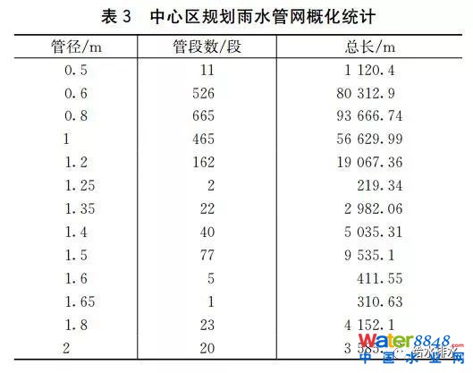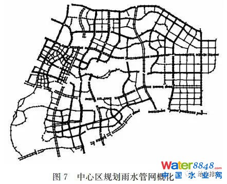 傳統(tǒng)開發(fā)和海綿開發(fā)兩種模式下,雨水管網(wǎng)系統(tǒng)的布置沒有變化,海綿模式只是通過改變地面下墊面特征,使傳統(tǒng)開發(fā)模式下的雨水管網(wǎng)更高效、更完善。根據(jù)“控規(guī)”,中心區(qū)地下雨水管網(wǎng)包括現(xiàn)狀管網(wǎng)和規(guī)劃管網(wǎng),管網(wǎng)總長(zhǎng)約277.03 km,其中現(xiàn)狀雨水管總長(zhǎng)約80.77 km,規(guī)劃雨水管總長(zhǎng)約196.26 km。經(jīng)統(tǒng)計(jì),管徑在600~1 000 mm的管段長(zhǎng)度占總長(zhǎng)度的83%,統(tǒng)計(jì)情況見表3,概化后的雨水管網(wǎng)平面布置見圖7。