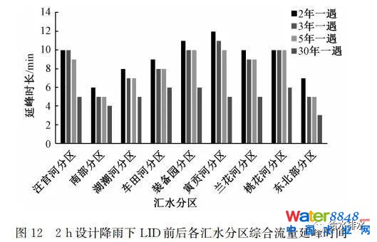 從圖12中可以看出,不同重現(xiàn)期設(shè)計(jì)降雨條件下,低影響開發(fā)措施對(duì)各匯水分區(qū)徑流峰值峰現(xiàn)時(shí)間的延遲效果有所不同,峰現(xiàn)時(shí)間延遲最長(zhǎng)的工況為12 min,最短為3 min。各匯水分區(qū)中,寅貢河分區(qū)、裝備園分區(qū)的延峰效果相對(duì)明顯。