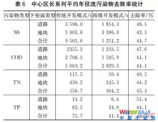 海綿開發(fā)模式將因地制宜采取多種低影響措施進(jìn)行建設(shè),為便于比較,將傳統(tǒng)開發(fā)模式作為采取海綿開發(fā)模式前的本底條件的估計(jì)。根據(jù)控規(guī)確定的城市用地布局,分別統(tǒng)計(jì)道路和地塊的傳統(tǒng)開發(fā)模式、海綿城市開發(fā)模式(即LID)下的年徑流污染物總量,以及海綿城市開發(fā)模式相對(duì)傳統(tǒng)開發(fā)模式的各項(xiàng)污染物去除率,見表6。