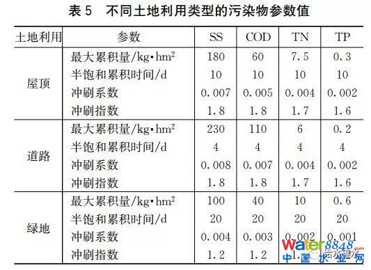 依據(jù)1991~2016年逐時(shí)連續(xù)降雨系列,利用貴安新區(qū)中心區(qū)海綿城市模型體系中的產(chǎn)污模塊,以SS、COD、TN、TP 4種污染物質(zhì)為對(duì)象進(jìn)行徑流污染控制模擬。其中,污染物累積模型選擇飽和函數(shù)累積模型,污染物沖刷模型選擇指數(shù)沖刷模型,參考本地以往相關(guān)研究結(jié)果及相鄰相似區(qū)域經(jīng)驗(yàn),本次計(jì)算的累積及沖刷參數(shù)取值見表5。
