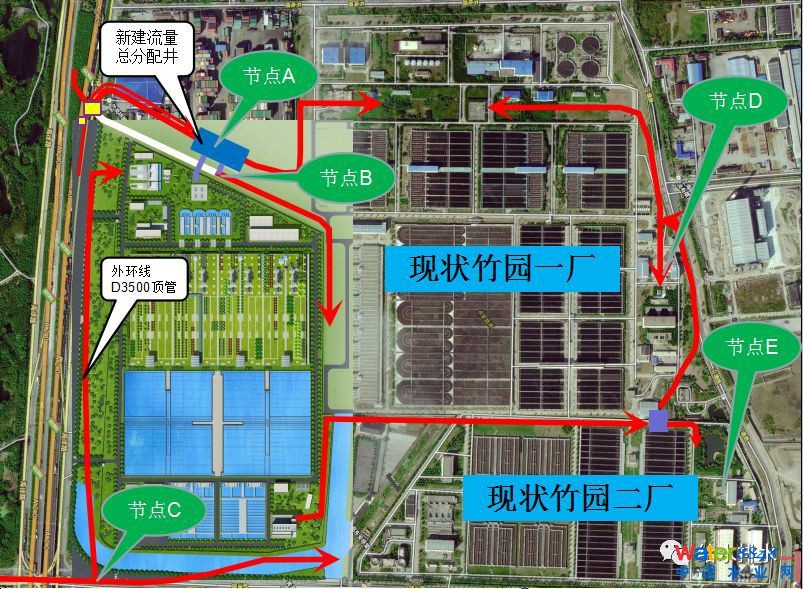 三座廠格局從一廠170萬噸減量提標,減了60萬噸。二廠原來50萬立方/天,減到30萬噸,這樣新建80萬噸升級補量,整個水量還是220萬立方米/天,從升級補量工程來看,也解決了雨水溢流問題,初期雨水污染預(yù)留了一塊地,所以這樣在第一個關(guān)鍵點,新建配水要兼顧升級補量廠和初雨四廠,整個方案,下面是往上調(diào)水20萬噸,上面是旱季170萬噸的分流,雨季規(guī)模更大,而且不能斷水,環(huán)保要求施工過程中要保持整體運行。