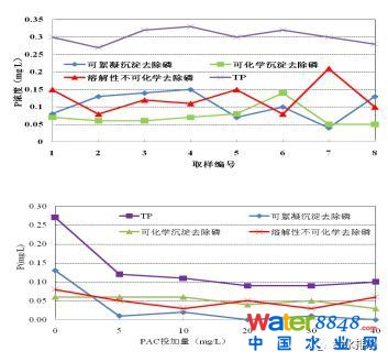 污水中各種形態(tài)磷的比例對于TP達標(biāo)影響較大。通過試驗發(fā)現(xiàn),出水中可化學(xué)沉淀去除磷和可絮凝沉淀去除磷濃度較低,在0.05-0.15mg/L之間,而溶解性不可化學(xué)去除磷濃度波動范圍在0.06-0.2mg/L之間。可以保證物化深度處理出水TP標(biāo)。