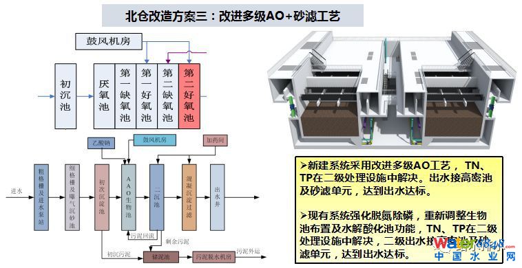推薦采用“改進多級AO工藝+反硝化生物濾池+高密度澄清池+V型濾池+臭氧高級氧化工藝方案”。