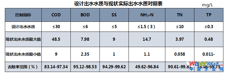 從數(shù)據(jù)對比來看,在90%的保證率下,實際進水水質(zhì)中BOD 低于原設(shè)計水質(zhì),COD、SS比設(shè)計值略高。SS低于原設(shè)計進水水質(zhì)。TN、NH3-N、TP比設(shè)計值略低?傮w上實際進水水質(zhì)與原設(shè)計進水水質(zhì)較接近。因此,綜合考慮實際進水水質(zhì)、原設(shè)計進水水質(zhì)和下水道水質(zhì)標(biāo)準(zhǔn),此次提標(biāo)對BOD、COD 和SS 進行微調(diào),確定本工程設(shè)計進水水質(zhì)。