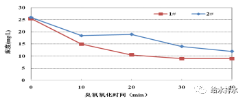 對于難生物降解COD,通過試驗可以看出,臭氧對1#和2#水樣COD的去除量分別為16.5和12mg/L,去除率分別達到65%和54%。