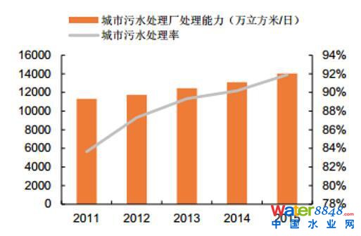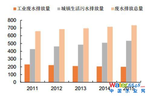 水 污染現(xiàn)狀與工業(yè)廢水、城鎮(zhèn)生活污水排放密切相關(guān)。2011年以來我國廢水排放總量呈上升趨勢(shì),污水治理需求不斷提升;趯(duì)水環(huán)境的深切擔(dān)憂,加強(qiáng)水污染防范與城鎮(zhèn)污水治理被列為“十三五”期間環(huán)境治理的重點(diǎn)內(nèi)容,F(xiàn)有污水處理廠的提標(biāo)改造以及污水處理廠的新建要求將推動(dòng)行業(yè)迎來収展黃金期。2011-2015年,我國工業(yè)廢水排放量逐年減少,城鎮(zhèn)生活污水排放量逐年增加。2015年,全國廢水排放總量為735.3億噸,其中工業(yè)廢水排放量為199.5億噸,城鎮(zhèn)生活污水排放量為535.2億噸。根據(jù)住建部最新數(shù)據(jù),2015年底我國共有1943座城市污水處理廠,處理能力為1.41億立斱米/日,城市污水處理率達(dá)91.9%。