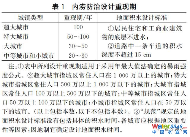 《規(guī)范》規(guī)定的內(nèi)澇防治設(shè)計重現(xiàn)期,應(yīng)根據(jù)城鎮(zhèn)類型、積水影響程度和內(nèi)河水位變化等因素,經(jīng)技術(shù)經(jīng)濟比較后按表1取值!兑(guī)范》明確重現(xiàn)期的同時,提出了相應(yīng)的地面積水設(shè)計標準,即居民住宅和工商業(yè)建筑物的底層不進水、道路中一條車道的積水深度不超過15cm,當?shù)孛娣e水不滿足要求時,應(yīng)采取滲透、調(diào)蓄、設(shè)置行泄通道和內(nèi)河整治等措施。還規(guī)定對超過內(nèi)澇防治設(shè)計重現(xiàn)期的降雨,應(yīng)采取應(yīng)急措施。