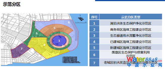 在上述因素的考量下,我們確定了從中心到周邊的示范分區(qū)類型,包括湖泊水體生態(tài)保護凈化示范區(qū)、商務(wù)街區(qū)海綿工程建設(shè)示范區(qū)等7種。原來我們用傳統(tǒng)的理念做,現(xiàn)在考慮的是如何海綿化,如用一個綠化隔離帶和臨港森林相結(jié)合,形成了生態(tài)廊道雨水自蓄凈化池。